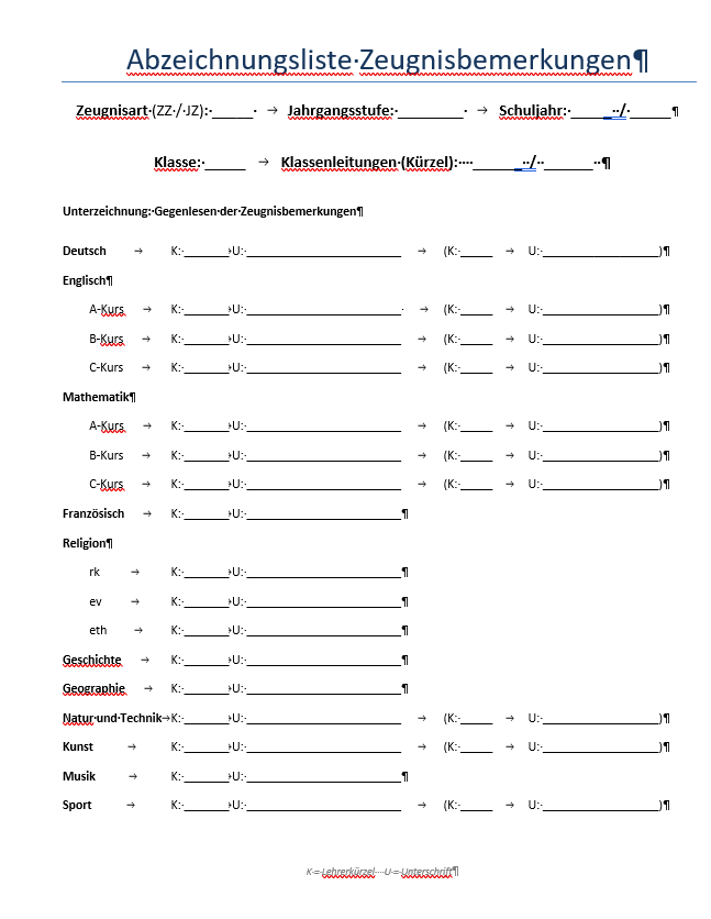 Abzeichnungsliste Zeugnisbemerkungen